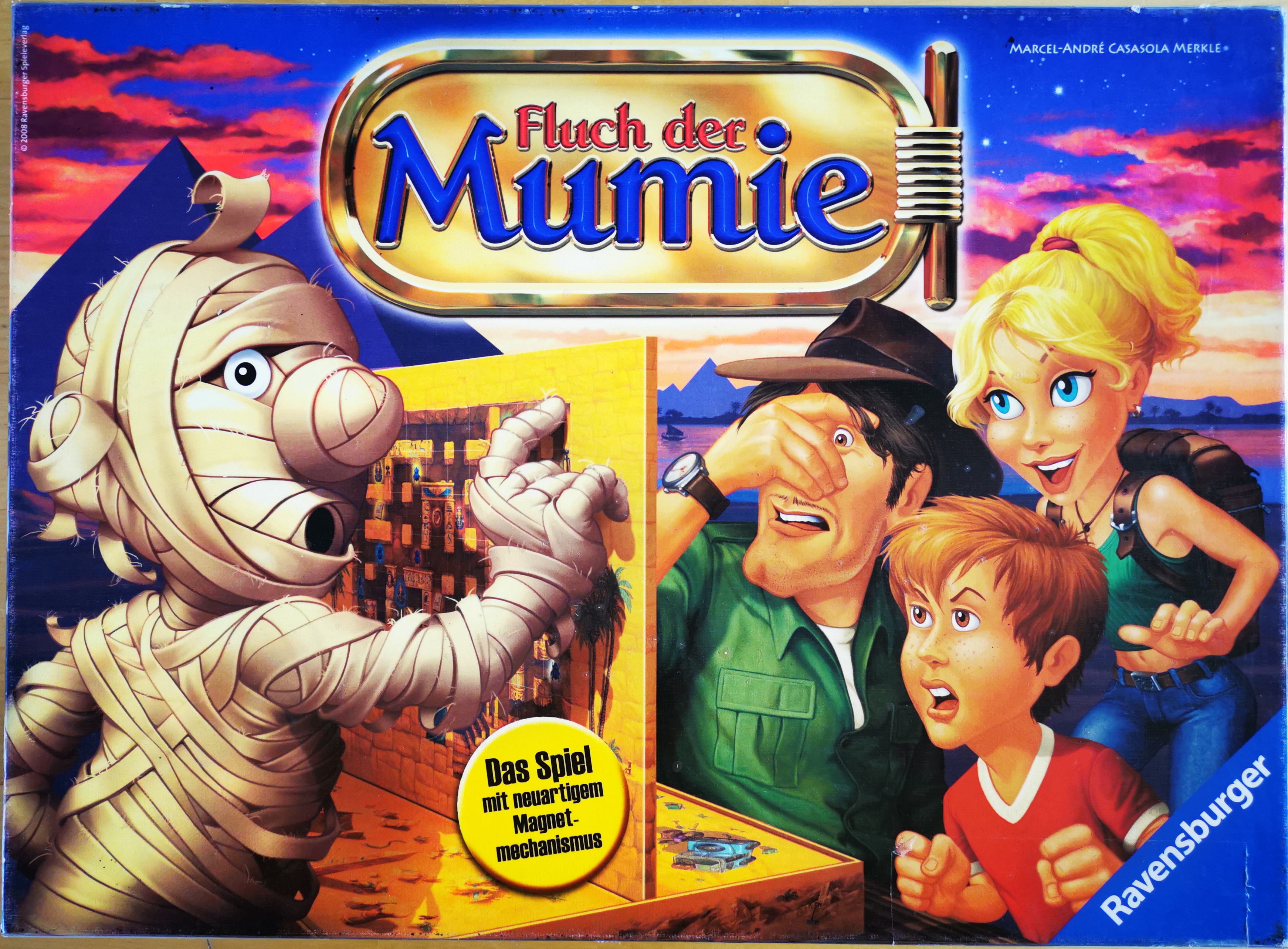 Matériel : 1 règle du jeu en allemand et sa traduction en français, 1 plateau magnétique (labyrinthe), 2 petits plateaux de jeu, 6 dés spéciaux, 1 figurine aimantée momie et son pion blanc, 4 pions colorés aimantés, 12 jetons de vie (ankh en 3 fois 4 couleurs différentes), 23 cartes de mission (5 rouges, blanches, et bleues ; et 4 vertes et jaunes).
