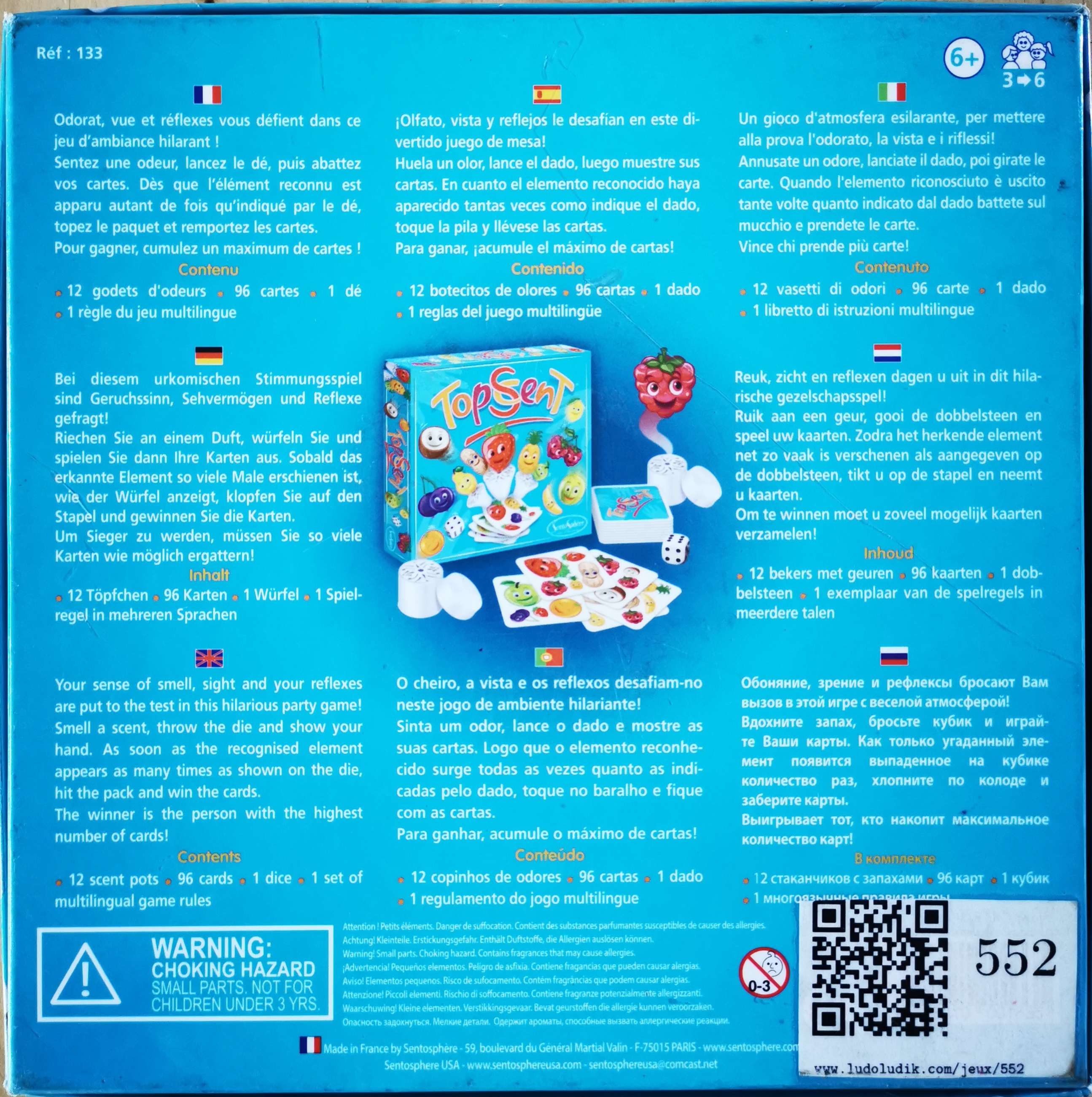 Matériel : 1 règle du jeu, 1 dé, 12 capsules odorantes, 96 cartes.